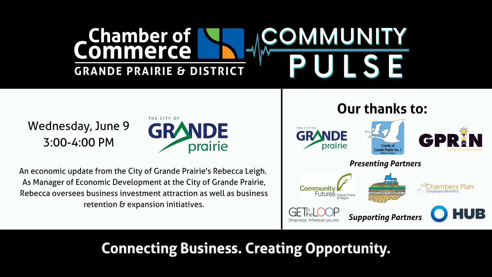 Thank you to our Presenting Partners: City of Grande Prairie Economic Development, County of Grande Prairie Economic Development, and Grande Prairie Regional Innovation Network; and our Supporting Partners: Chambers Plan represented by local broker HUB International, Community Futures Grande Prairie & Region, GetintheLoop Grande Prairie, and Municipal District of Greenview.